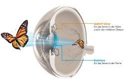 Liberty2 ist ein Zweilinsensystem: Es besteht aus zwei Kunstlinsen in einem Auge, die smart miteinander kombiniert und somit auf individuelle Sehbedürfnisse abgestimmt werden können. Während eines ambulanten Eingriffs werden beide Kunstlinsen ins Auge eingesetzt. Dabei wird die Augenlinse gegen eine Basislinse getauscht, die das Sehen in die Ferne korrigiert. Im zweiten Schritt wird eine zusätzliche multifokale Linse – die AddOn®-Linse – vor die Basislinse implantiert. Sie sorgt für das scharfe Sehen in der Nähe und in der PC-Distanz.